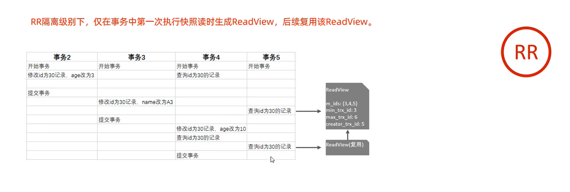 REPEATABLE READ: 仅仅在事务第一次执行快照读时生成ReadView,后续复用该readview