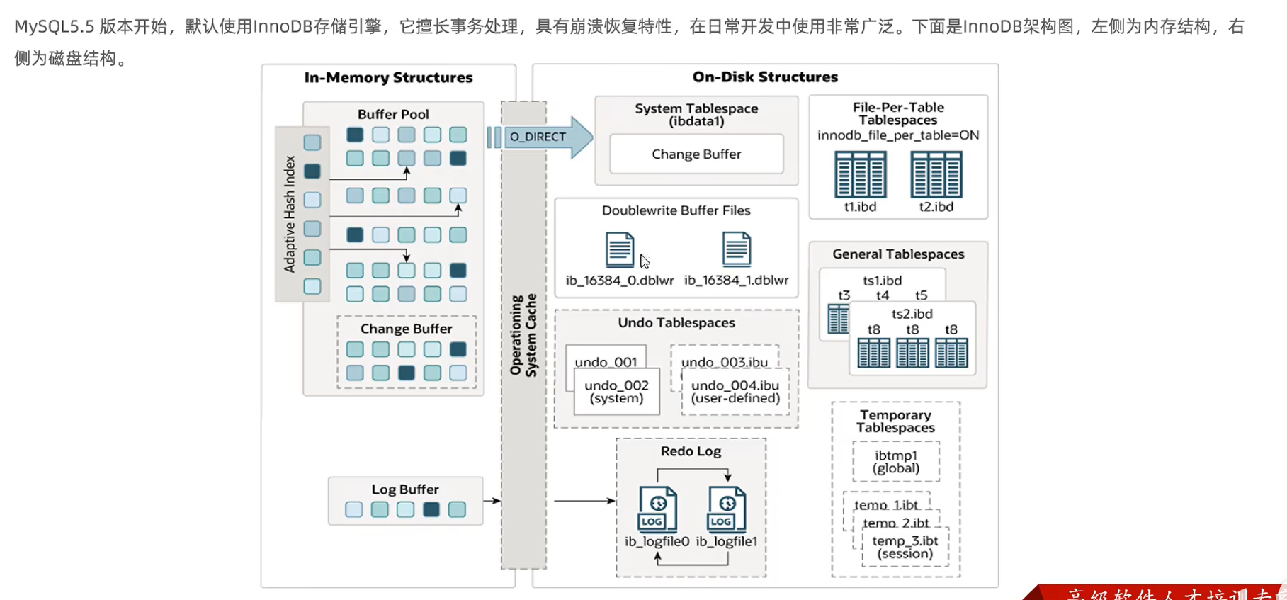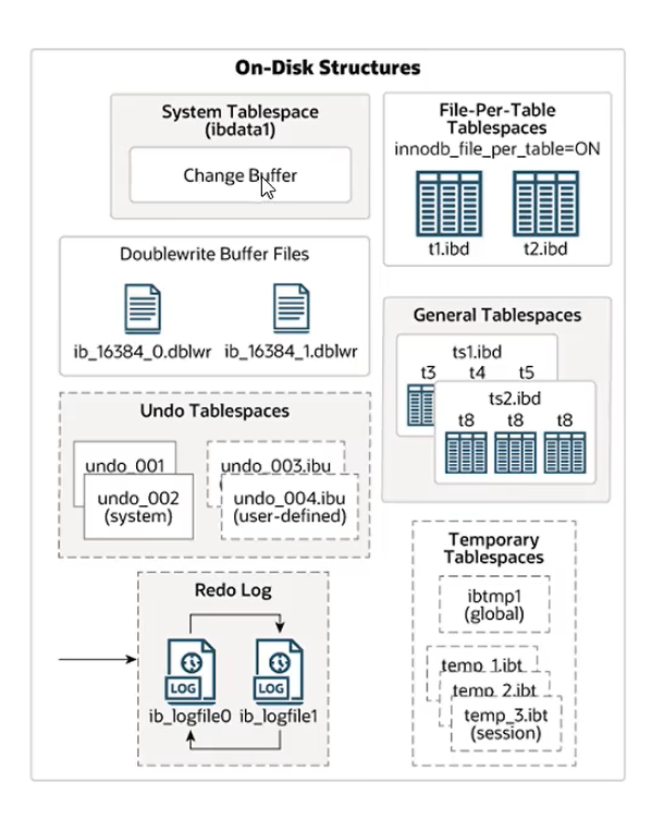 temporary tablespace:Innodb使用会话临时表空间和全局临时表空间,存储用户创建的临时表等数据。