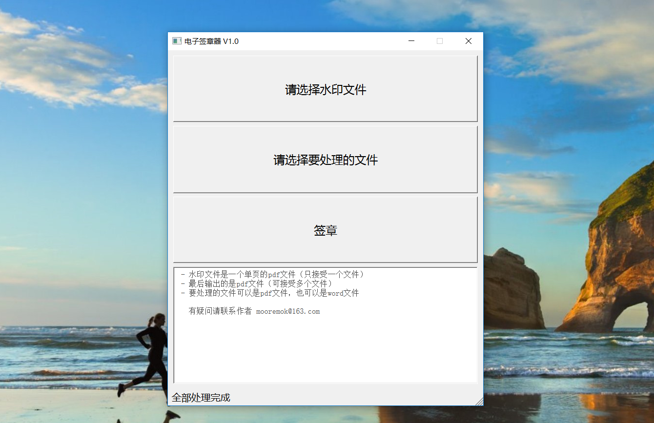 在开始时,我实现了一个自定义线程,其中work是实现业务逻辑的模块,此时我将信号signal_for_accept绑定了自身的work模块,signal_for_accept信号的类型为列表,那么在word中,需要有一个参数来接收这个信号的内容。话说得那么长,其实很简单,打开软件,点击签章的按钮时,UI线程将所有的文件列表传给了自定义线程的work,由work来处理这些文件。对应着类WaterMarkMainWindow,当用户点击签章时,就会调用start方法,从而调用signal_for_accept.emit(),将文件列表发送给了work模块。