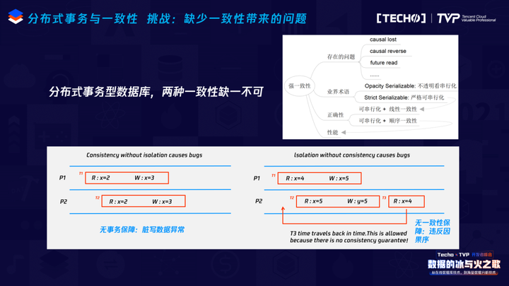 SQL标准定义了四种数据异常、四种隔离级别,James Gray在里1995年的一篇论文定义了八种数据异常、八种隔离级别,在这种情况下,如果突然又发现第9个数据异常,按照SQL标准,它应该被放在这两个体系下的哪一个隔离级别之下?这样的问题在目前是不能回答的,而这也是TDSQL在做分布式数据库研发过程当中所遇到的、所要解决的问题,只有回答了这样的问题之后,一个系统才能真正做到强一致,所幸我们目前对这样的一个基础问题有了明确的答案,并且秉持腾讯开源精神,把这项研究结果开源到了3TS系统(Tencent Transaction Processing Testbed System)。