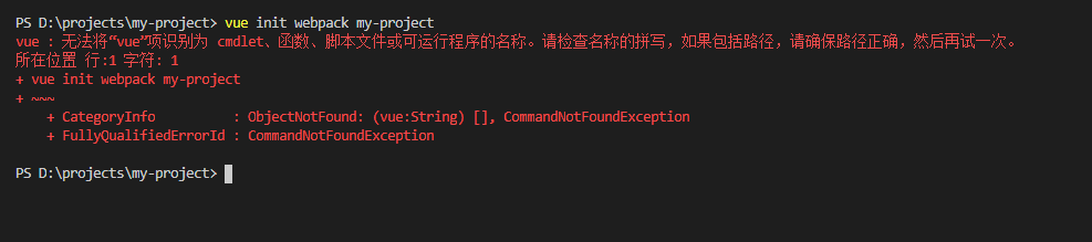 当使用vue初始化一个项目时,报错提示:无法将“vue”项识别为 cmdlet、函数、脚本文件或可运行程序的名称
