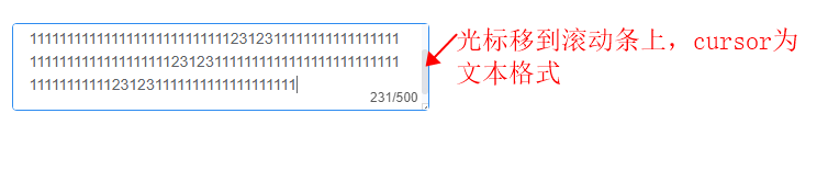原因:由于input框自身内置了cursor:text;属性,且滚动条始终在文本输入框内部,导致样式未生效。