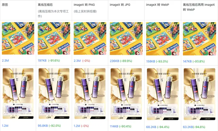 可以看到,对原图转 JPG 有明显的收益,转 WebP 收益更大。离线压缩收益比在线转 JPG 略高,对离线压缩后的图片再进行在线转 WebP 仍能得到压缩收益。