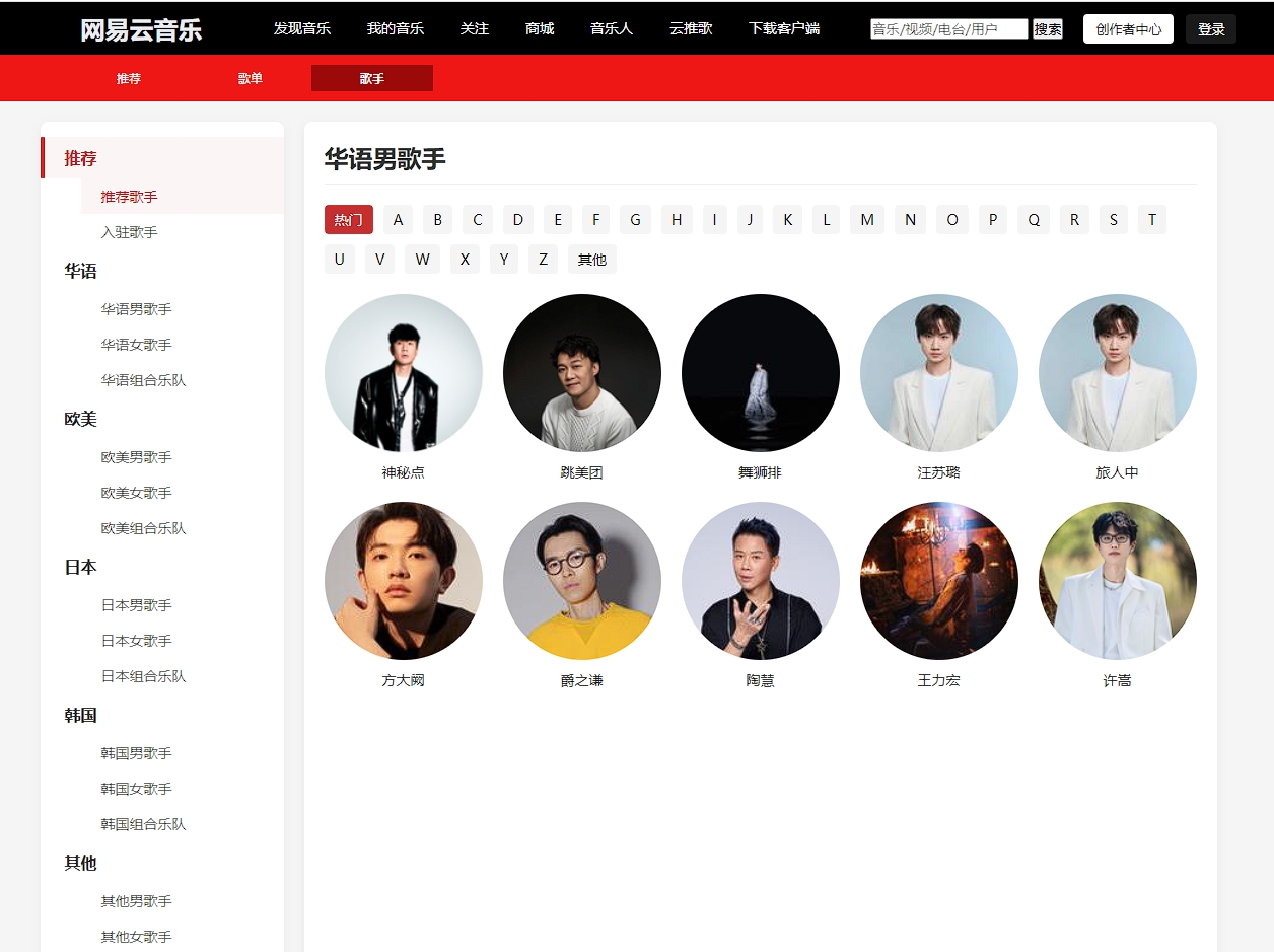 1 <!DOCTYPE html> 2 <html lang="en"> 3 4 <head> 5 <meta charset="UTF-8"> 6 <meta name="viewport" content="width=device-width, initial-scale=1.0"> 7 <title>Music</title> 8 <link rel="stylesheet" href="./styles/base.css"> 9 </link> 10 <link rel="stylesheet" href="./styles/index.css" type="text/css"> 11 </link> 12 <link rel="stylesheet" href="https://cdnjs.cloudflare.com/ajax/libs/font-awesome/5.15.4/css/all.min.css"> 13 </link> 14 <script type="module" src="./js/main.js"></script> 15 </head> 16 17 <script> 18 // 等待DOM加载完成 19 document.addEventListener('DOMContentLoaded', function() { 20 // 获取 Tab 容器和所有 Tab 项 21 const tabArea = document.querySelector('.red-tab-area'); 22 const tabs = tabArea.querySelectorAll('.tab-item'); 23 24 // 绑定点击事件 25 tabs.forEach(tab => { 26 tab.addEventListener('click', () => { 27 // 移除所有 Tab 的 active 类 28 tabs.forEach(t => t.classList.remove('active')); 29 // 为当前点击的 Tab 添加 active 类 30 tab.classList.add('active'); 31 32 // 根据点击的 Tab 执行不同逻辑(示例) 33 const tabText = tab.textContent.trim(); 34 switch (tabText) { 35 case '推荐': 36 console.log('切换到推荐页'); 37 break; 38 case '歌单': 39 console.log('切换到歌单页'); 40 41 window.location = 'gedan.html'; // 如果在同一个目录下 42 break; 43 case '歌手': 44 console.log('切换到歌手页'); 45 break; 46 } 47 }); 48 }); 49 50 const discoverBtn = document.querySelector('.find-music'); 51 discoverBtn.addEventListener('click', function() { 52 if (tabArea.style.display === 'none') { 53 tabArea.style.display = 'flex'; 54 } else { 55 tabArea.style.display = 'none'; 56 } 57 }); 58 59 }); 60 </script> 61 62 <body> 63 <div class="header"> 64 <div class="container"> 65 <h1> 66 <!-- logo --> 67 <a href="#" class="logo"> 68 </h1> 69 <h1 class="logo"><a href="www.baidu.com">网易云音乐</a></h1> 70 </a> 71 <!-- 导航 --> 72 <ul class="nav"> 73 <li class="nav-item find-music"><a href="#" class="歌单">发现音乐</a></li> 74 <li class="nav-item"><a href="###">我的音乐</a></li> 75 <li class="nav-item"><a href="###">关注</a></li> 76 <li class="nav-item"><a href="###">商城</a></li> 77 <li class="nav-item"><a href="###">音乐人</a></li> 78 <li class="nav-item"><a href="###">云推歌</a></li> 79 <li class="nav-item"><a href="###">下载客户端</a></li> 80 </ul> 81 <!-- 搜索与右侧功能区 --> 82 <div class="search-and-actions"> 83 <!-- 搜索框 --> 84 <div class="search"> 85 <input type="text" placeholder="音乐/视频/电台/用户" class="keywords"/> 86 <button class="search-btn">搜索</button> 87 </div> 88 <!-- 右侧功能区 --> 89 <div class="header-actions"> 90 <a href="#" class="creator-center">创作者中心</a> 91 <a href="#" class="login">登录</a> 92 </div> 93 </div> 94 </div> 95 </div> 96 <!--红色tab区域--> 97 <div style="display: none;" class="red-tab-area" id="redTabArea"> 98 <div class="tab-item active">推荐</div> 99 <div class="tab-item">歌单</div> 100 <div class="tab-item">歌手</div> 101 </div> 102 103 <div class="wonderful module"> 104 <div class="container"> 105 <div class="title-wraper wonderful-title"> 106 <div class="wonderful-content"> 107 <div class="item ad"> 108 <ul class="ad-list"> 109 <li><a href="###"><img src="./images/jike.jpg" /></a></li> 110 <li><a href="###"><img src="./images/zhangyunlei.jpg" /></a></li> 111 <li><a href="###"><img src="./images/TNT.jpg" /></a></li> 112 </ul> 113 <div class="ad-btn"> 114 <span>1</span> 115 <span>2</span> 116 <span>3</span> 117 </div> 118 <a href="javascript:;" class="btn-left btn"><</a> 119 <a href="javascript:;" class="btn-right btn">></a> 120 </div> 121 122 </li> 123 </ul> 124 </div> 125 </div> 126 </div> 127 </div> 128 129 <div class="recommend module"> 130 <div class="container"> 131 <div class="title-wraper wonderful-title"> 132 <h3 class="title"><a href="###">歌手专区</a></h3> 133 </div> 134 135 <ul class="recommend-list"> 136 <li class="recommend-list-item"> 137 <a href="###"> 138 <div class="front"> 139 <div class="contents"> 140 <img class="thumbnail" src="./images/wangjunkai.jpg" /> 141 <h4 class="title">王俊凯(Karry),1999年9月21日出生于重庆市, 142 中国内地影视男演员、流行乐歌手 143 </h4> 144 </div> 145 </div> 146 <div class="back back-1"> 147 <div class="contents"> 148 </div> 149 </div> 150 151 </a> 152 153 </li> 154 <li class="recommend-list-item"> 155 <a href="###"> 156 <div class="front"> 157 <div class="contents"> 158 <img class="thumbnail" src="./images/zhoujielun.jpg" /> 159 <h4 class="title">周杰伦(Jay Chou),1979年1月18日出生于中国台湾新北市, 160 华语流行乐男歌手、音乐人</h4> 161 </div> 162 </div> 163 <div class="back back-2"> 164 <div class="contents"> 165 </div> 166 </div> 167 </a> 168 </li> 169 <li class="recommend-list-item"> 170 <a href="###"> 171 <div class="front"> 172 <div class="contents"> 173 <img class="thumbnail" src="./images/zhangbichen.jpg" /> 174 <h4 class="title">张碧晨(Diamond),1989年9月10日出生于天津市, 175 中国内地流行乐女歌手 </h4> 176 </div> 177 </div> 178 <div class="back back-3"> 179 <div class="contents"> 180 </div> 181 </div> 182 </a> 183 </li> 184 <li class="recommend-list-item"> 185 <a href="###"> 186 <div class="front"> 187 <div class="contents"> 188 <img class="thumbnail" src="./images/linjunjie.jpg" /> 189 <h4 class="title">林俊杰(JJ Lin),1981年3月27日出生于新加坡, 190 华语流行乐男歌手、音乐人、影视演员</h4> 191 </div> 192 </div> 193 <div class="back back-4"> 194 <div class="contents"> 195 </div> 196 </div> 197 </a> 198 </li> 199 <li class="recommend-list-item"> 200 <a href="###"> 201 <div class="front"> 202 <div class="contents"> 203 <img class="thumbnail" src="./images/majiaqi.jpg" /> 204 <h4 class="title">马嘉祺,2002年12月12日出生于河南省郑州市, 205 中国内地流行乐男歌手、演员。 206 </h4> 207 </div> 208 </div> 209 <div class="back 
