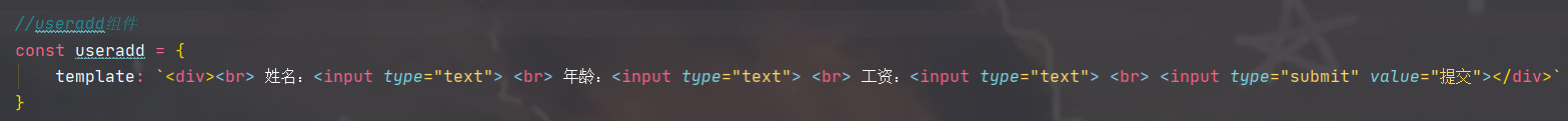 template: `<div><br> 姓名:<input type="text"> <br> 年龄:<input type="text"> <br> 工资:<input type="text"> <br> <input type="submit" value="提交"></div>`