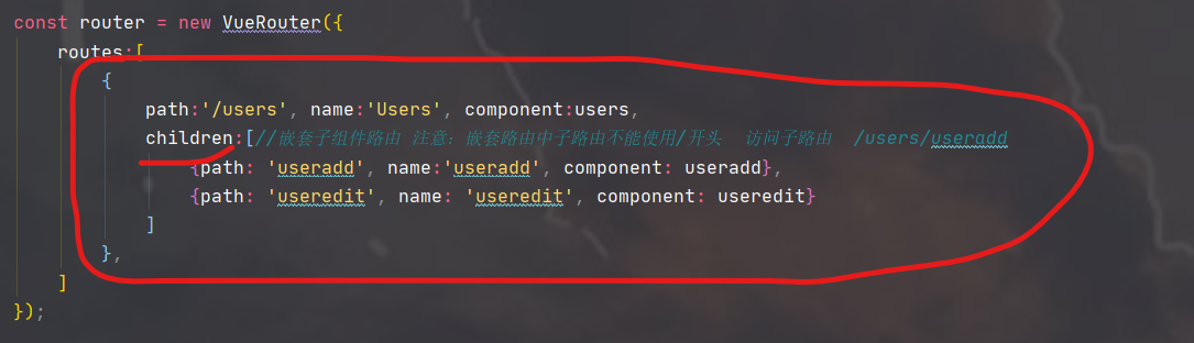 children:[//嵌套子组件路由 注意:嵌套路由中子路由不能使用/开头 访问子路由 /users/useradd