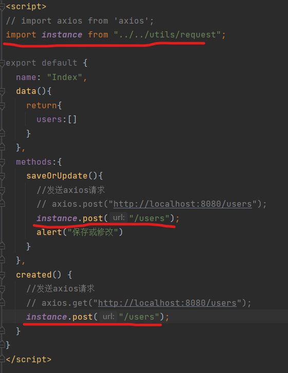 (3)但是,我们获取数据需要发送axios请求,点击修改或者保存按钮后还需要发送axios请求更新我们的数据,会多次发送axios请求,耦合性太强,也不方便