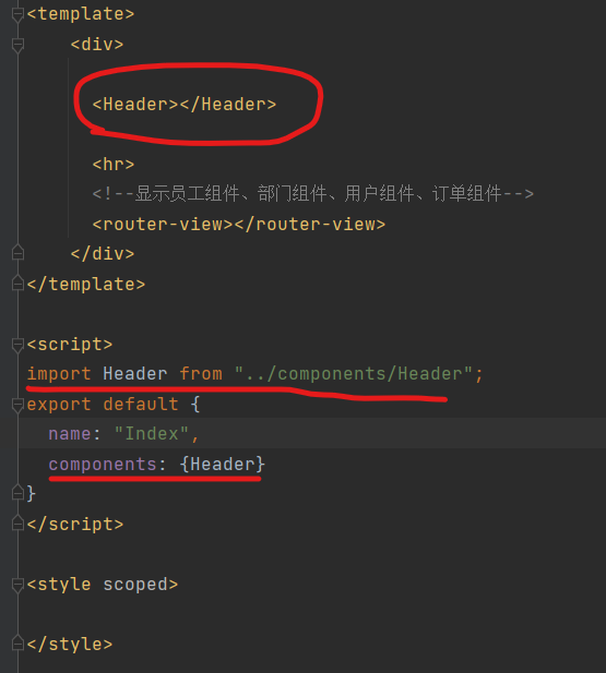 我们只需要敲<Header></Header>即可,编译器会自己将我们的公共部分进行import导入,并且当作子组件添加到component中