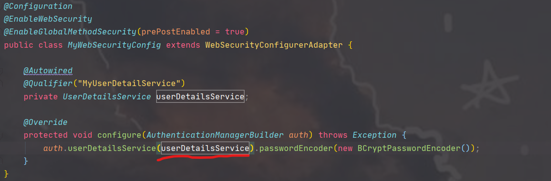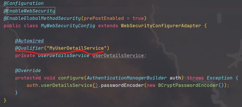 但是自动注入UserDetailsService后报错,原因是有多个UserDetailsService,所以我们要给我们编写的MyUserDetailsService指定一个名称