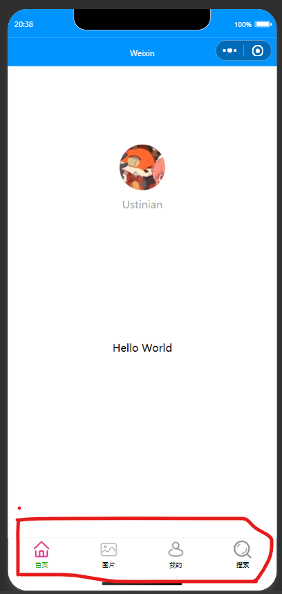 (2) "navigationBarTitleText": "Weixin" : 定义导航栏的名称