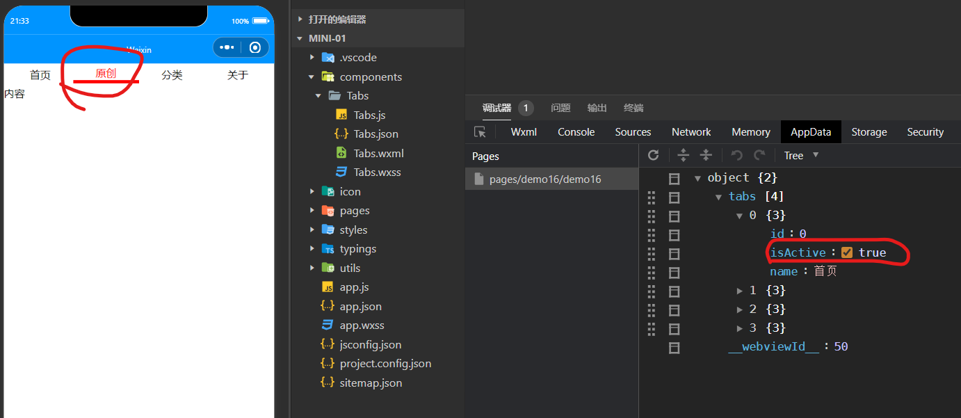 我们刚开始,是在首页这里,当我们点击原创后,我们希望原创的isActive变成true,而首页的isActive变成false。我们查看控制台的AppData,发现首页的isActive还是true