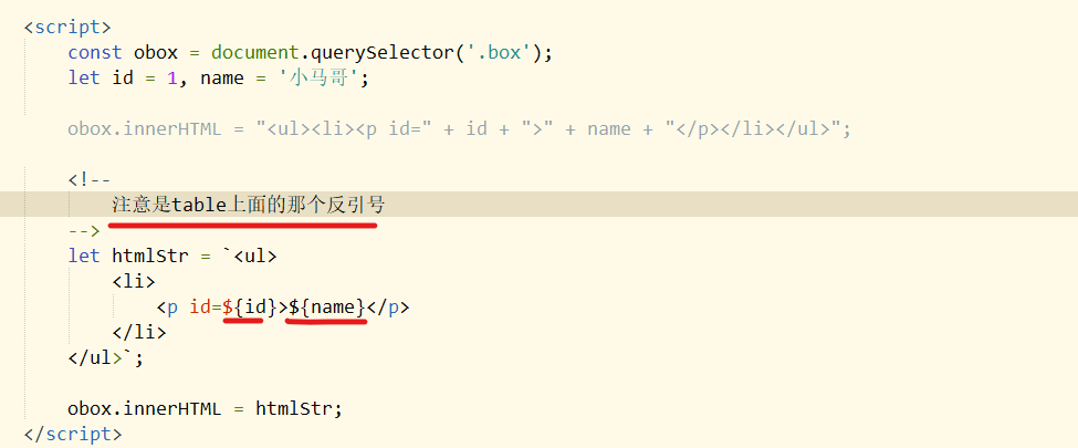 模板字符串:使用tab上面的那个反引号,插入变量使用${变量名};