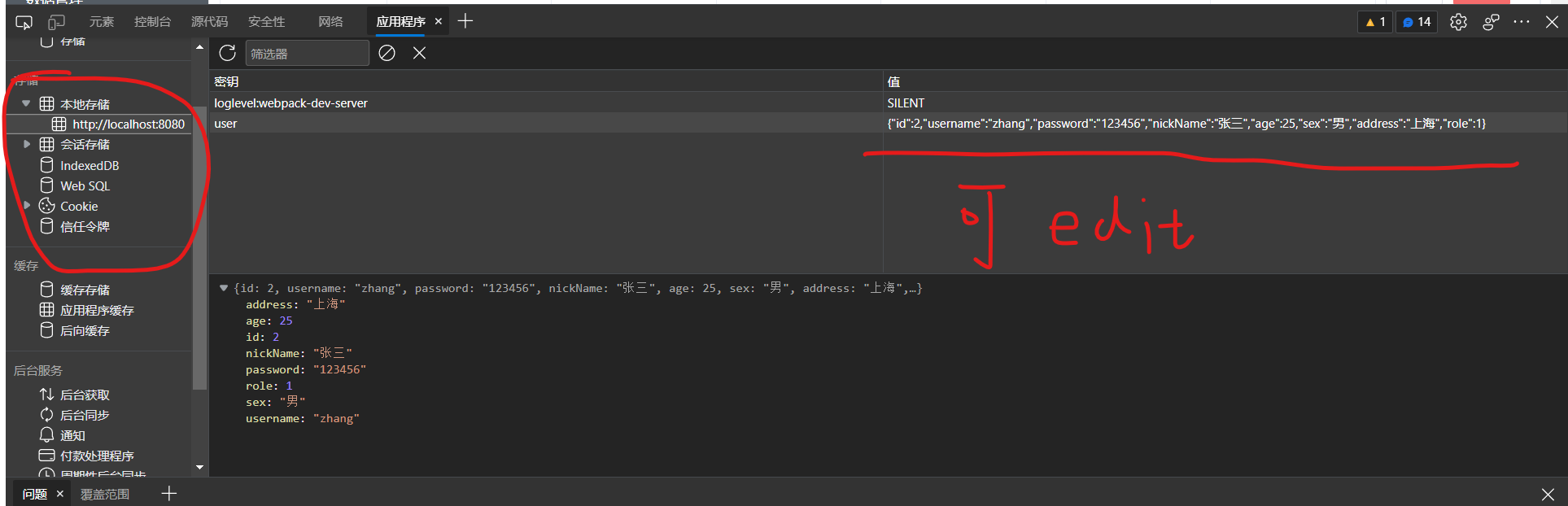 系统登录的时候我们把登录的用户信息存储到了localStorage中,即缓存中,但这是极不安全的,因为我们可以通过浏览器修改缓存,如下