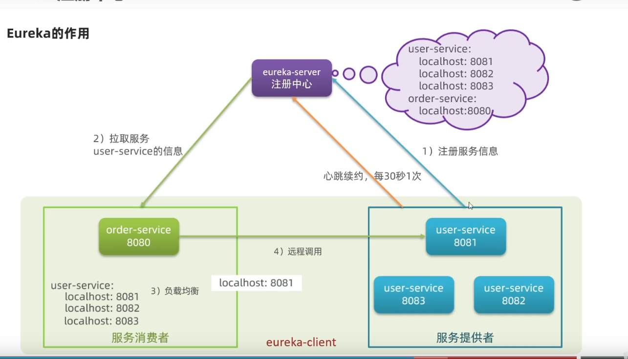 通过心跳续约,如果服务一段时间没有跳动,注册中心就会将其剔除,保证我们消费者获取到的服务都可以使用