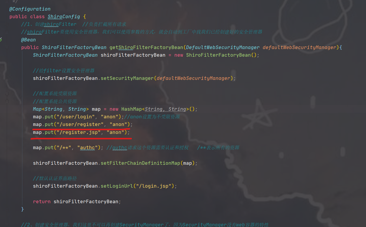 要把访问register.jsp登录页面也设置为不受限资源。为什么当时我们没有设置登录页面呢?因为shiro默认的认证页面就是我们的登录页面login.jsp