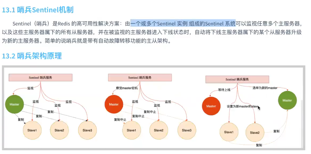 一般都会选取多个哨兵,因为如果一个哨兵的话,万一出现网络延迟,我们哨兵误认为我们的主机宕机,重新选取了要给主机,这样就会出现了两个主机,即【脑裂】