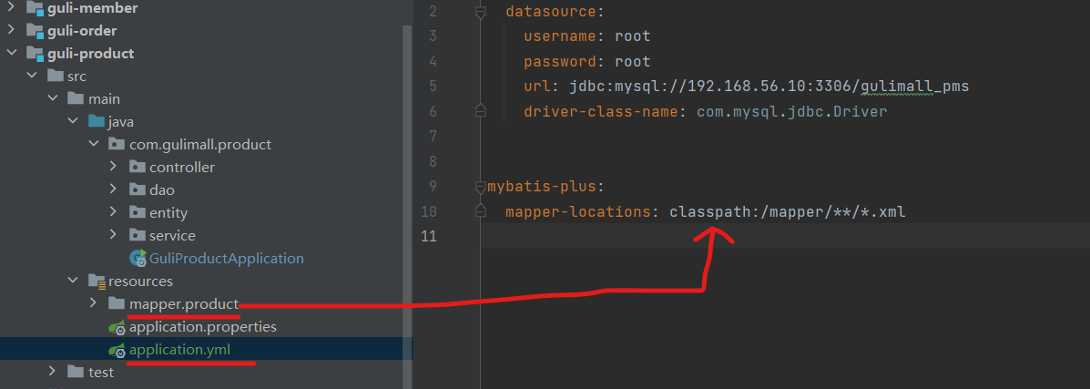 ②告诉mybatisplus的sql映射文件位置(在application.yml中设置)