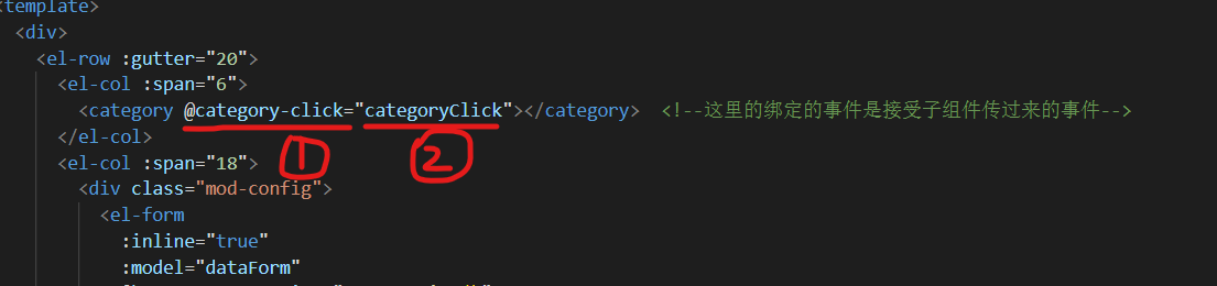 ①处是子组件传过来的事件名,②处是父组件自己调用的方法