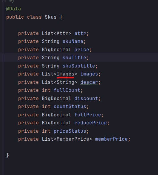 对于关联实体类,比如Skus实体类中关联了Image实体类
