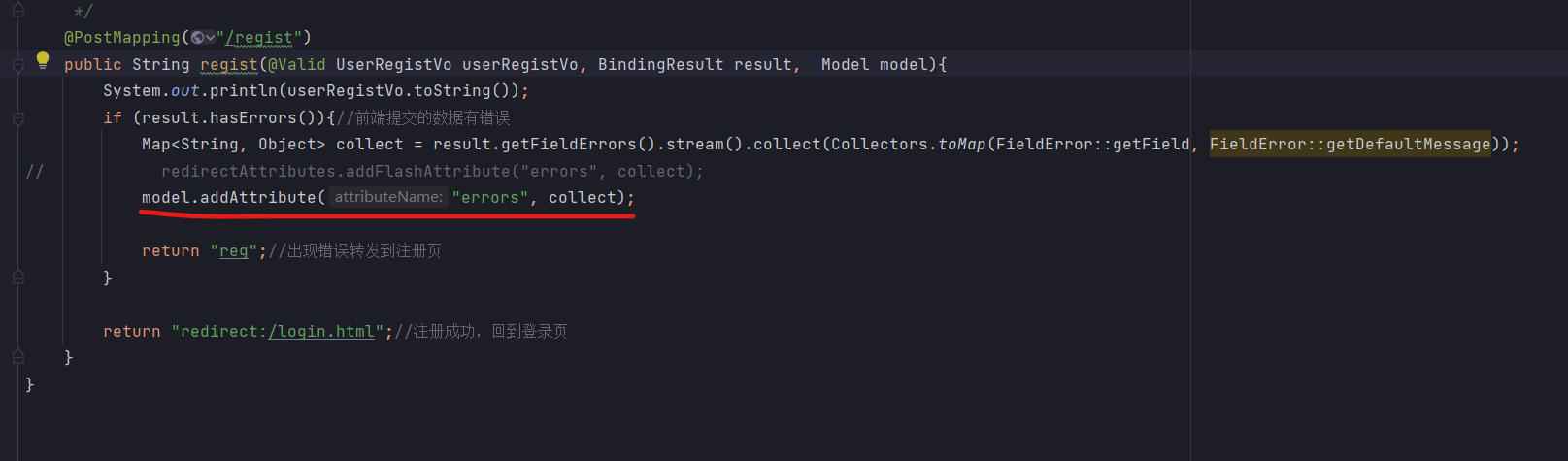 类似于这样,当我们输入错误数据,后端通过jsr303校验后发现错误,会通过Model给前端发送数据,前端页面通过thymeleaf取出后端发送的数据回显到页面上。