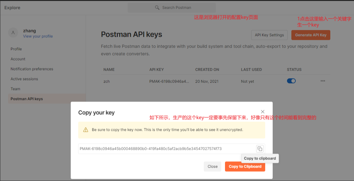 - 3.这里可以点击上图中的”postman-API-key“去生成一个key,或者这个页面:https://web.postman.co/settings/me/api-keys,生成之后千万copy下来保存好,因为只有这个时间能看到完整的key,后面只能重新生成、删除、开关这个key。