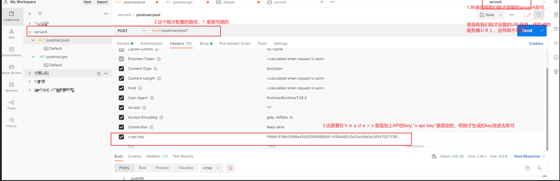 - 4.到这里无论是服务器、request请求、exmaple都已经有了,如果想修改服务器如下,图中也告诉了我们怎么去用这个服务器上的request以及提供的exmaple。