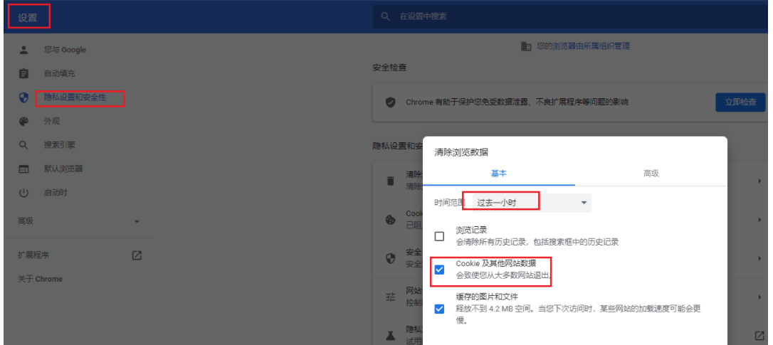 解决方法2:如果代理确确实实关了还是打开异常,考虑一下原本打开过的网页的缓存问题等,在设置-隐私设置和安全性-清除浏览数据,我这边打开异常的网页是近一小时内打开的,我选择清空过去一小时内的数据,再次打开刚才的网页,已经恢复正常。
