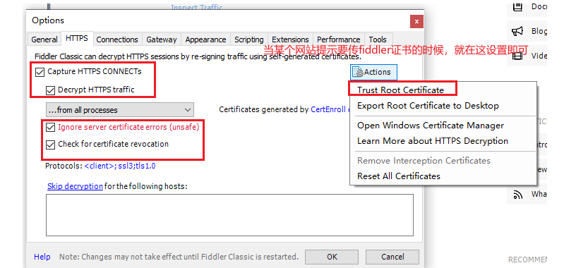 fiddler提示某网站要求上传相关证书:其实在配置阶段就需要将fiddler代理的证书配置好,否则有些应用不信任fiddler的话拦截会出问题,如下:也是在tools-options中设置: