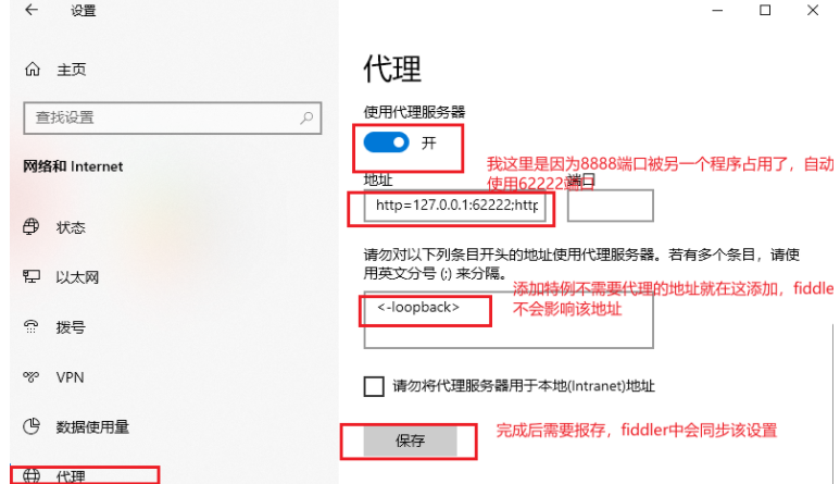 代理设置方法一,新手代理,fiddler中设置如下,这样子fiddler就会自动同步本机电脑的代理设置信息,缺点是整个电脑都是这样配置的代理,就除了自己添加不代理的地址外,基本都会受到fiddler的影响