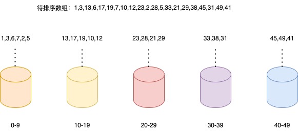 例如上图,我们预定义了五个桶,每个桶只能存放某个数据范围的数字,例如第一个桶只能存放大于等于0且小于等于9的数字,以此类推。