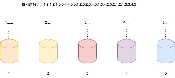 假设待排序的数组长度为n,而且这个数组的数据范围也不大,比如最小值是1,最大值是5,那我们就可以按照这个数据特征来创建5个桶,每个桶里只存放等值数据,例如第一个桶只放1,以此类推。
