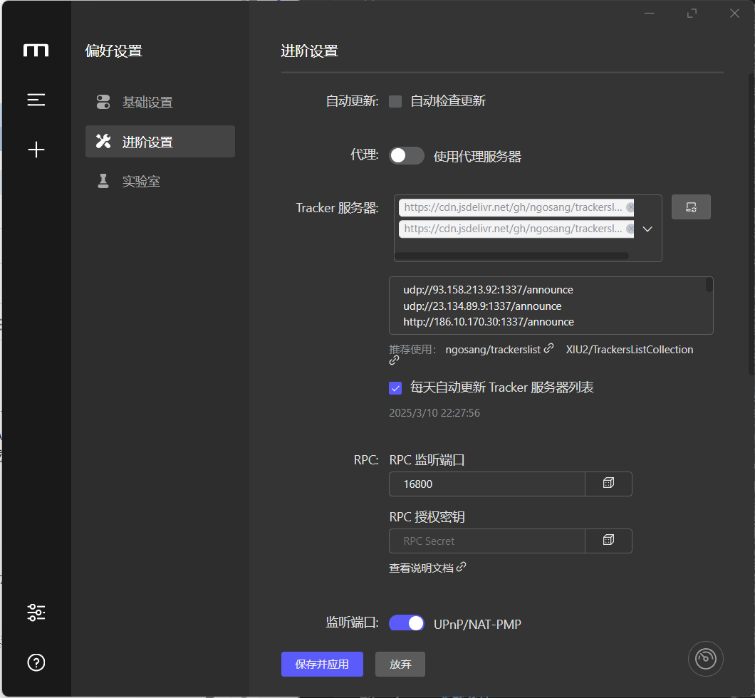 进阶设置中,也可以手动添加tracker服务器,也可以自动更新服务器列表,使下载速度如虎添翼。
