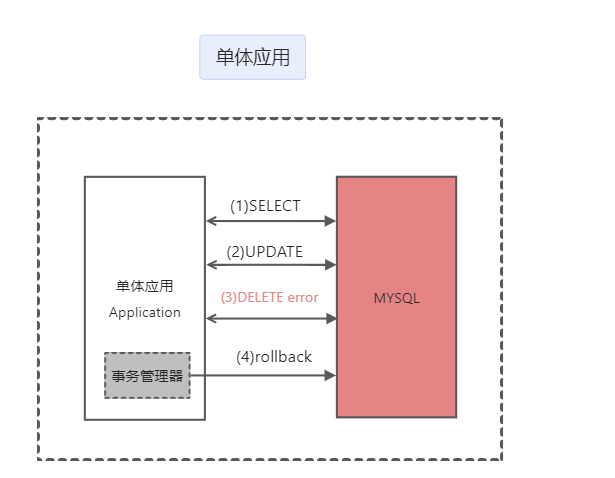 单体服务一个事务下当一个操作异常,被事务管理器捕捉到,调用mysql的回滚,就可保证事务数据一致性