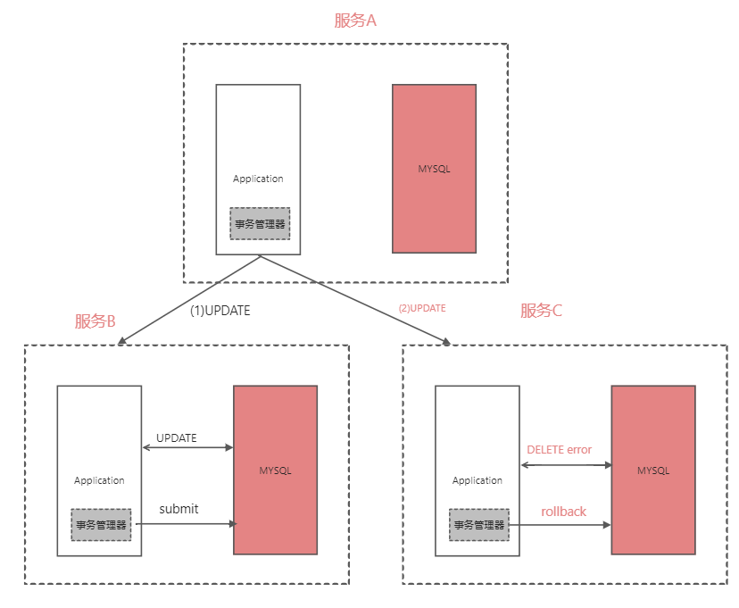 当服务A区调用服务B进行修改,无异常,事务提交,服务A在调用服务C进行修改,却异常,事务回滚,因为服务的独立性无法传播给服务B,就产生了脏数据了