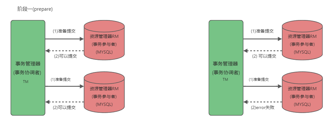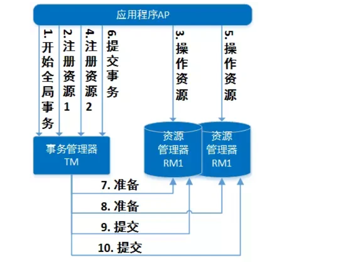 2PC具体是指两阶段提交, prepare准备提交为一阶段,submit 提交为二阶段(成功和回滚)