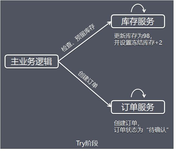 try阶段里面主要也是代码逻辑扣减库存和订单创建,乍一看,这不是和原来单个接口实现一样的吗,NO,其实不是这样的,在try里面引入了冻结和状态的概念