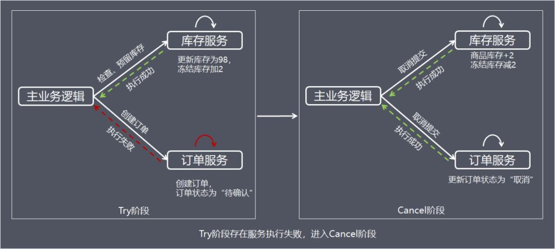 C(Cancel):try预占资源执行失败,释放Try阶段资源