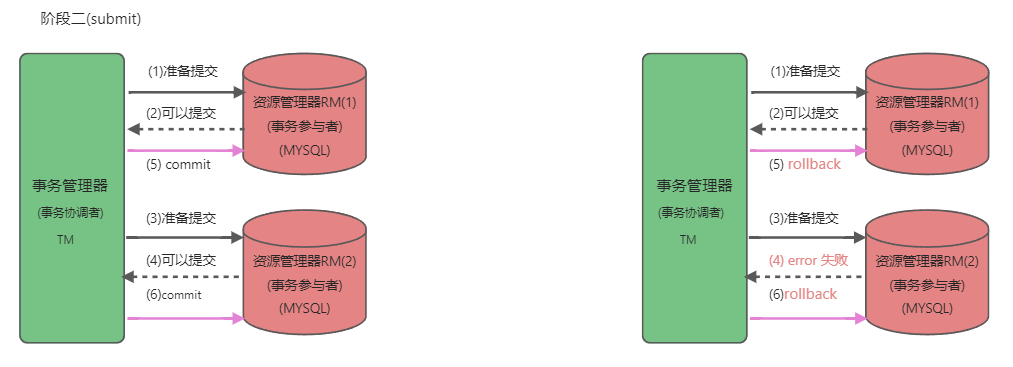 二阶段为Commit最终提交,commit提交和rollback回滚提交两种方式,选择那种方式提交,是由TM告诉RM是提交还是回滚,TM根据一阶段prepare的ACK机制知道哪些RM失败或成功