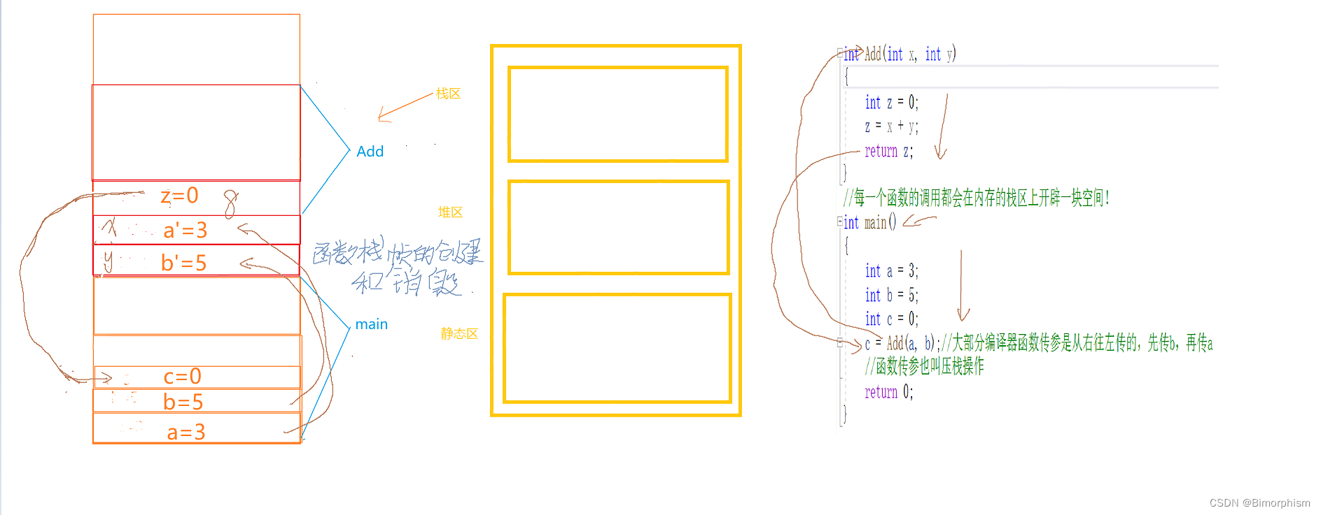 // c = Add(a, b);//大部分编译器函数传参是从右往左传的,先传b,再传a