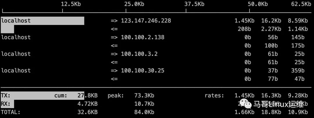 1.界面上面显示的是类似刻度尺的刻度范围,为显示流量图形的长条作标尺用的。2.中间的<= =>这两个左右箭头,表示的是流量的方向。3.TX:发送流量4.RX:接收流量5.TOTAL:总流量6.Cumm:运行iftop到目前时间的总流量7.peak:流量峰值8.rates:分别表示过去 2s 10s 40s 的平均流量