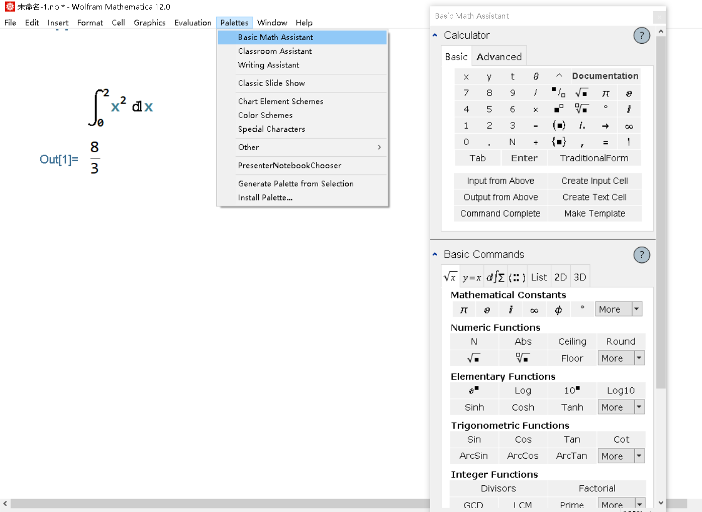 依次点击面板[Palettes],数学助手[Basic Math Assistant],即可利用出现的工具编辑公式,利用数学助手,我们可以跳过MMA的语法直接进行数学运算,可以把它当成更高级的计算器使用。
