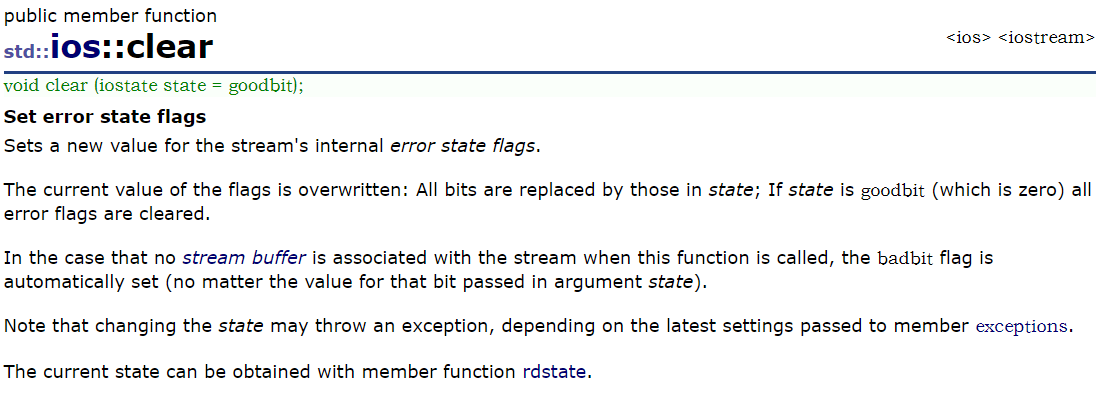 - C++文档:http://www.cplusplus.com/reference/ios/ios/clear/