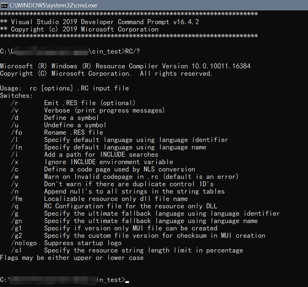 好奇心下,我打开我的VS2019命令行提示工具(工具-命令行-开发者命令提示工具,输入RC/?)