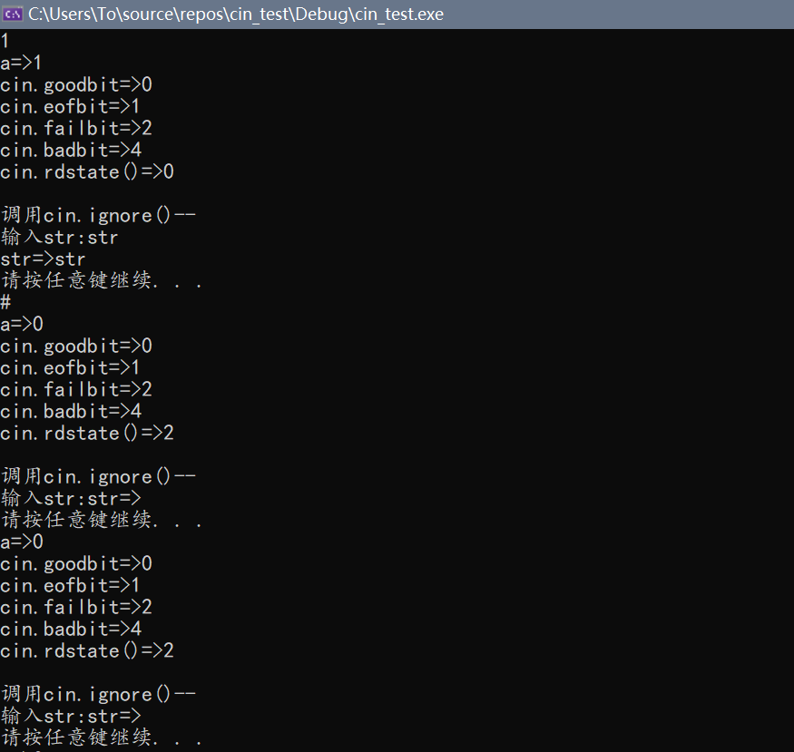 可以看出:在调用了cin.ignore()函数之后,str无法取出错误的字符“#”,表示忽略了缓冲区内容,但还是不能继续输入str,原因在于没有调用cin.clear()使状态位还原。
