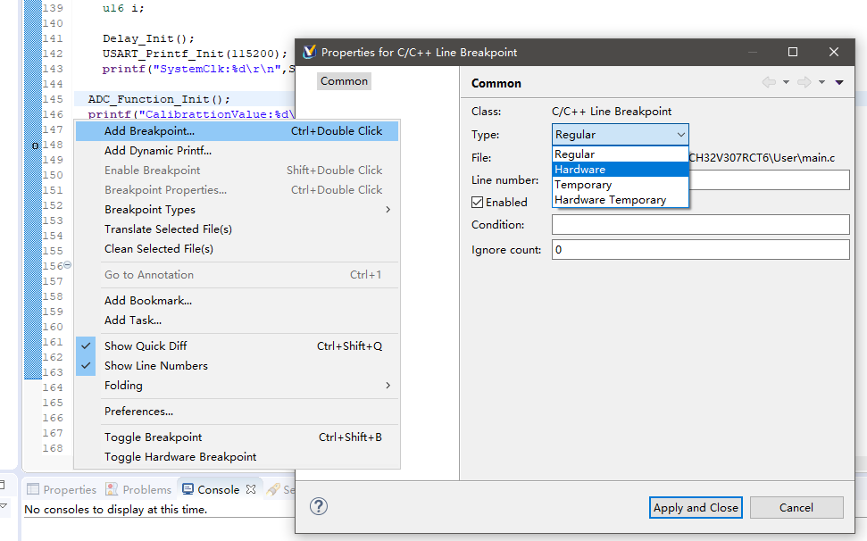【MRS V1.51支持CH32V30x应间断点调试,设置硬件断点方法如图5所示:在代码编辑区行号位置点击右键菜单Add Breakpoint,在弹出的配置页面中找到Type选项,选择Hardware后点击Apply and Close】