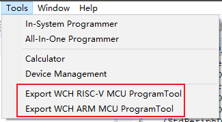 【点击主菜单Tools->Export WCH RISC-V MCU ProgramTool或Export WCH ARM MCU ProgramTool,可选择分别导出WCH RISC/ARM MCU本地编程工具,如图6所示】