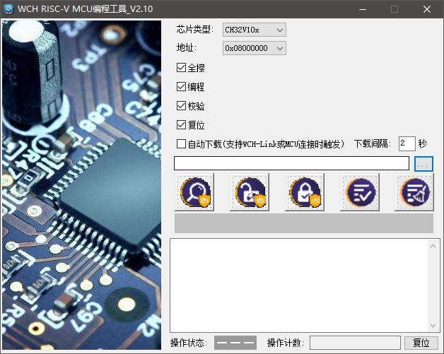 【该两种工具支持CH32V10x,CH32V30x,CH56x,CH57x,CH58x,CH32F10X等RISC-V/ARM内核MCU的Flash相关操作,如开关代码读保护、关闭两线仿真调试接口、擦除、编程、校验、复位等,软件界面如图7,图8所示】