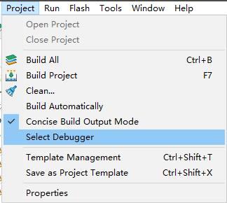 【MRS V1.51合并了目标芯片厂商以及调试器配置功能入口,可通过主菜单Project->Select Debugger或工程资源区按钮来打开配置界面,如图13,图14所示】