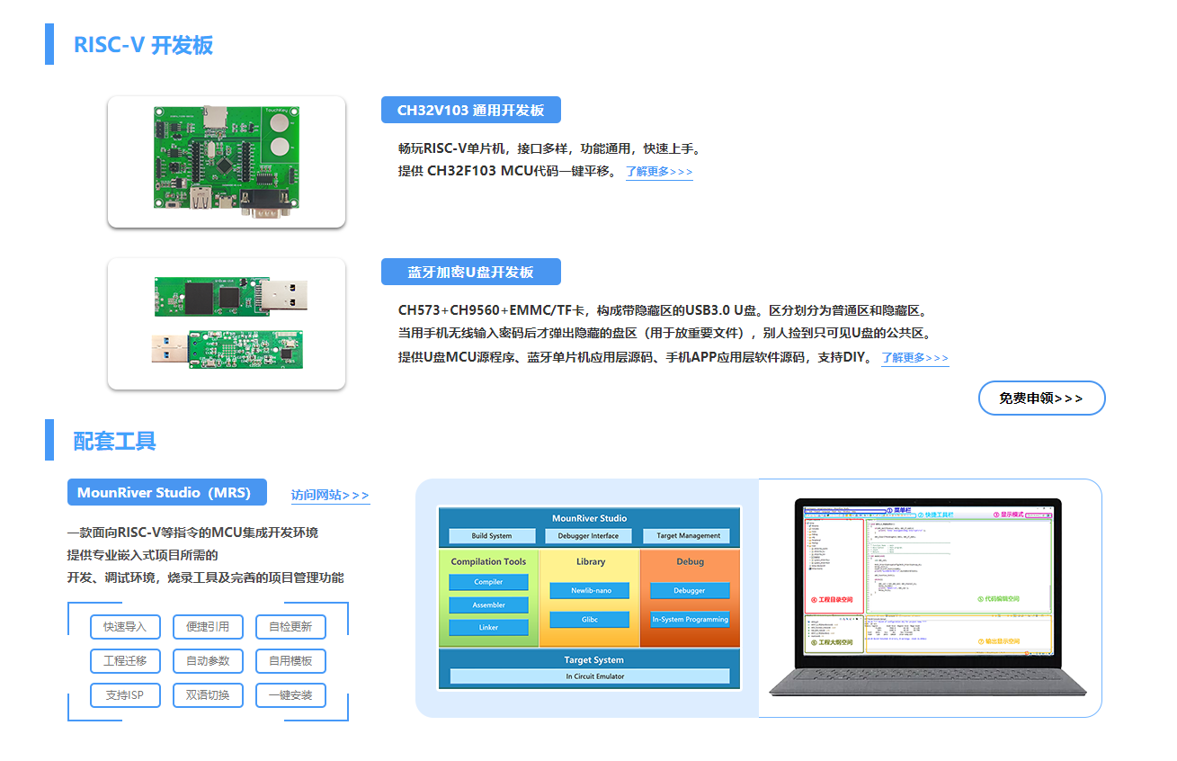 近年来,RISC-V生态发展一片欣欣向荣,众多行业巨头纷纷布局,国内也涌现了一批RISC-V内核的商用IP以及配套的集成开发环境。越来越多的商业方案和行业应用也选择了RISC-V内核MCU。以我个人开发经验为例,最近一个公司项目使用了南京沁恒微的CH32V103芯片,在WCH官网提交开发板申请之后,我前往其配套工具官网(www.mounriver.com)下载了对应的集成开发环境MounRiver Studio (MRS)最新版本。