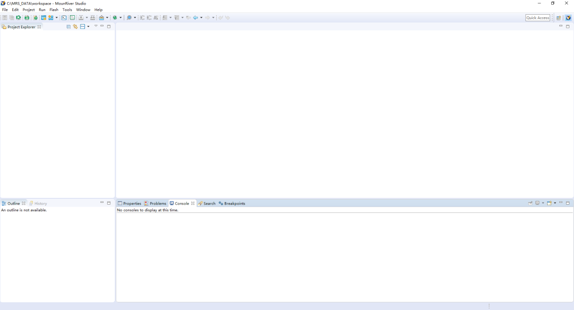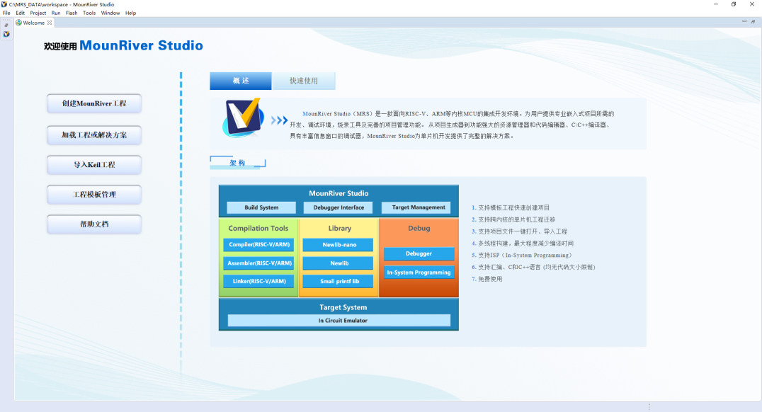 MRS下载包大约470M,安装过程很快,安装向导软件执行结束之后就可以直接打开MRS了,无需另行安装工具链或其他软件运行环境,还是蛮方便的。首次运行时页面如下: